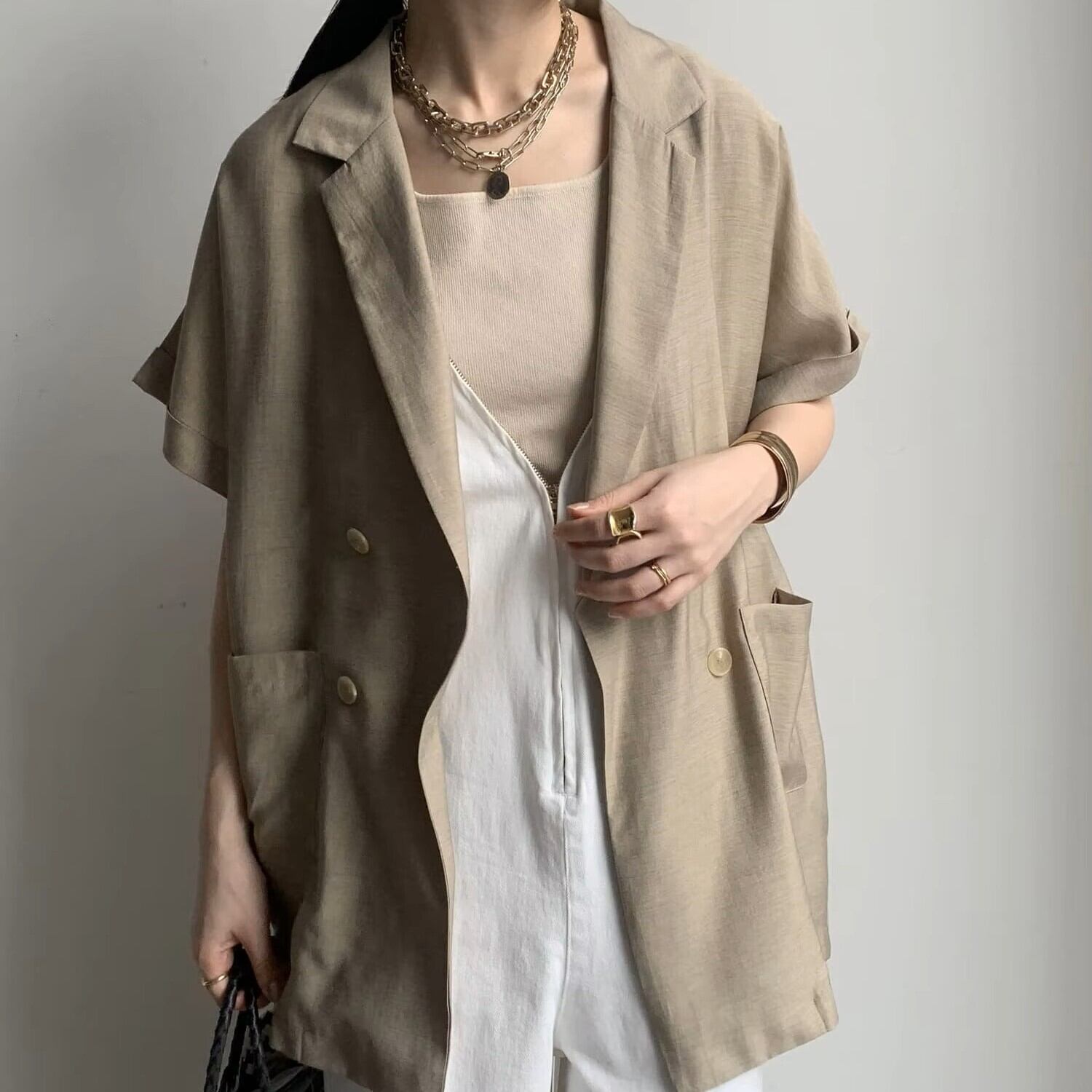 【快適な着心地と高級感】軽やかで通気性の良いリネン素材を使用しており、肌触りが良く、一日中着用しても快適です。ダブルブレストのディテールが、スタイルにエレガンスをプラスし、どんな体型の方でも美しく見せるサイズ展開があります!カジュアルでありながら洗練された雰囲気を演出します。
